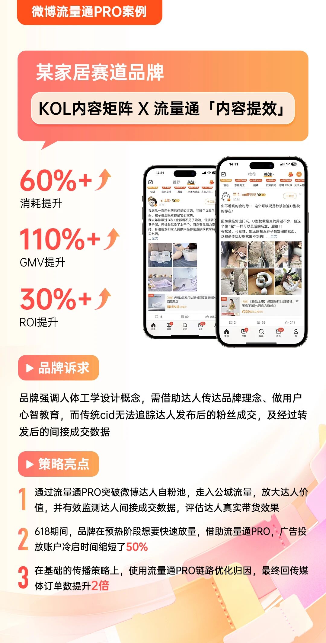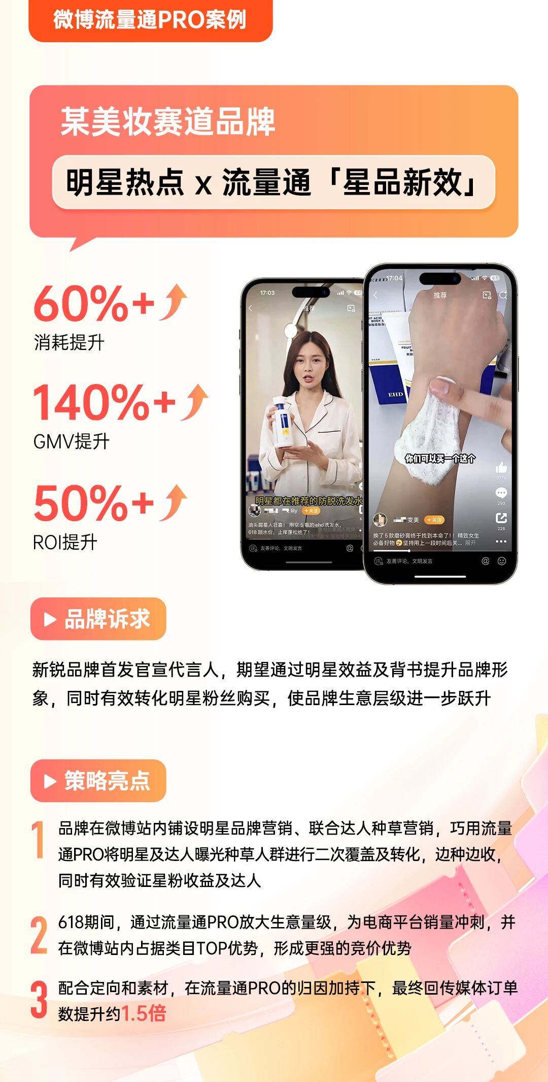 流量通PRO与微博内容营销结合,可帮助品牌实现聚焦节点爆破、高效收割兴趣人群等生意诉求。同时,流量通PRO赋能的数据追踪与内容优化能力,能解决投放中放量慢、ROI不稳定等效率问题,助力广告主提升广告效果,快速完成弯道超车。